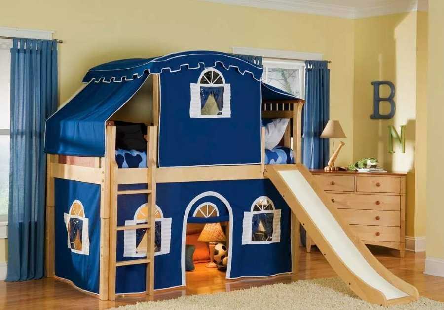 Для дошкольников подходит вариант с игровой зоной, оформленной в виде тканевого домика на нижнем уровне