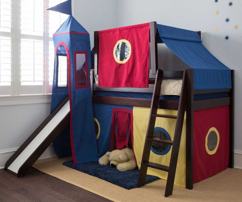 Кровать с зоной для игр для мальчишек часто имитирует внешний вид салона автомобиля, космического корабля, палатки в лесу или рыцарского замка. Этот потрясающий аттракцион подходит для увлекательных игр с друзьями.
