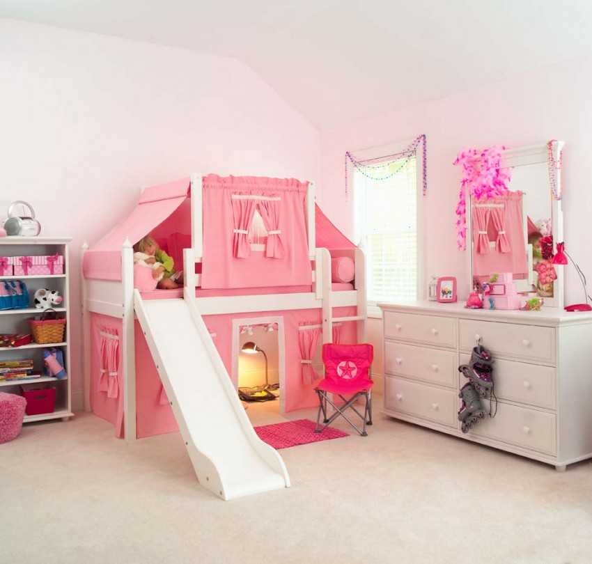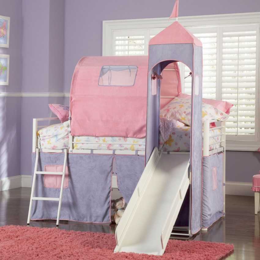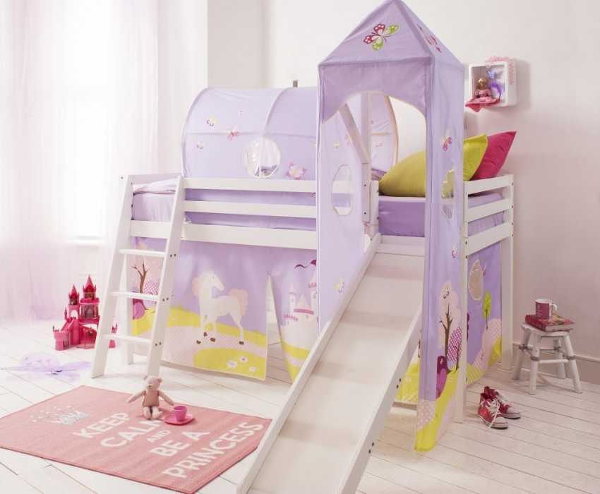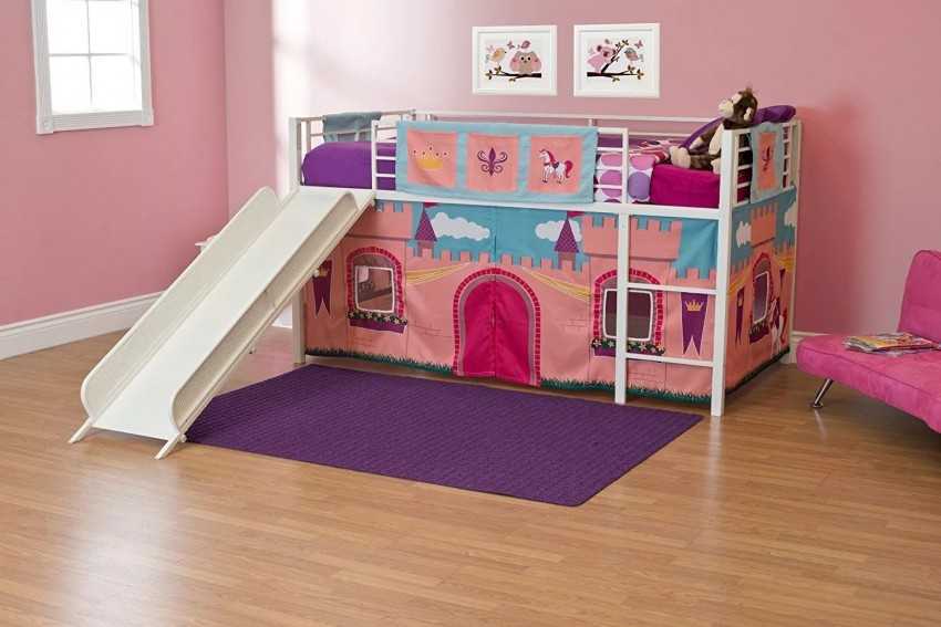 Отличным решением для девочек будет стилизация мебели под кукольный домик или замок принцессы. От спортивного инвентаря здесь можно отказаться в пользу инструментов для творчества. Например, на нижнем уровне кровати размещается мольберт или доска для рисования.