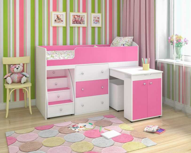 Классическая детская кровать чердак для девочки изготавливается в ярких цветах. Дополнительно родители могут установить балдахин, закрывающий спальное место.