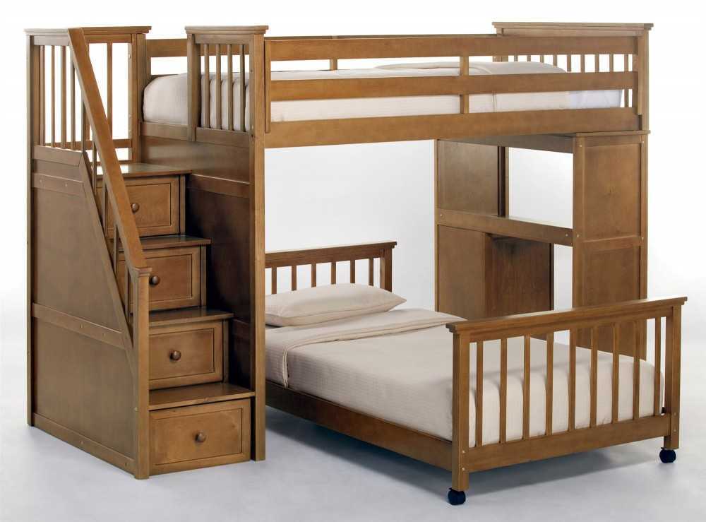Массив дерева — материал, который с годами не утратит востребованности. Сама природа позаботилась о том, чтобы оно было теплым и уютным. Когда дерево присутствует в интерьере, обстановка становится теплой и комфортной. Для изготовления детских кроватей применяют такие породы: дуб, ясень, бук и сосна. Последний материал стоит дешевле, срок службы у него меньше, так как плотность древесины ниже.