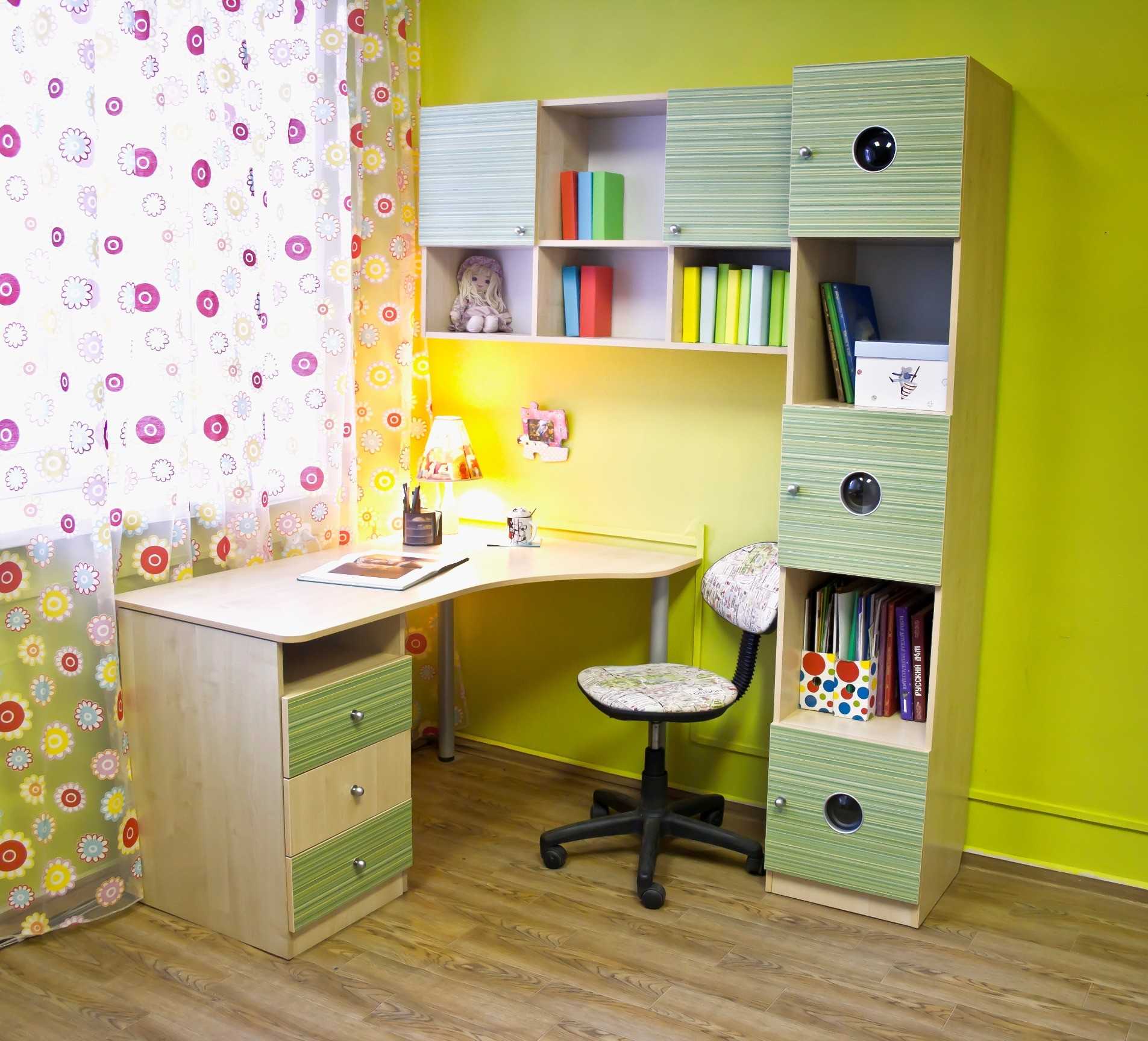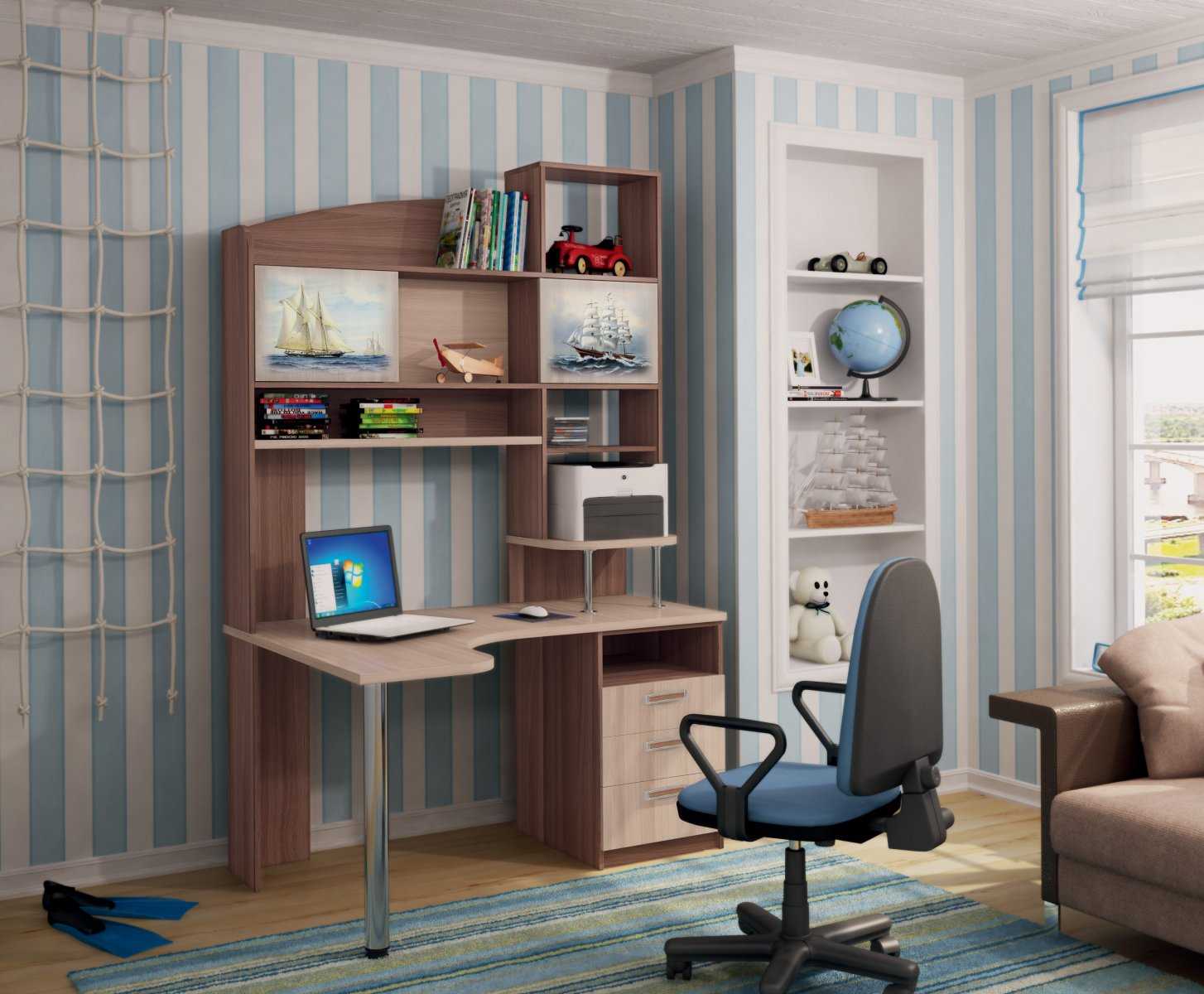 - стол для письма, или компьютерный его аналог. Часто родители совмещают эти два варианта в один, что является выходом для маленьких детских комнат. Стол может быть как стационарным, так и размещаться в стенке. Форма стола также зависит от габаритов помещения, она бывает прямоугольной или угловой;