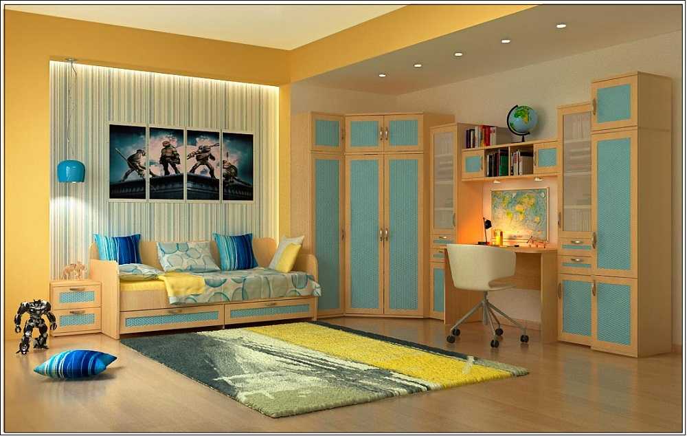 В широком помещении кровати можно расположить у противоположных стен. Место возле окна послужит учебной зоной. Если же комната узкая, то подойдет кроватка трансформер, которую можно спрятать. Также подойдет складной диван.