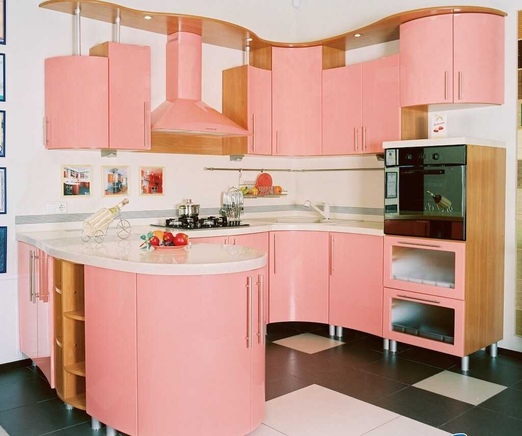 Г-образная кухня содержит угол 90 градусов, если установить трапециевидную тумбу, угол будет скошенным. Первый вариант подходит для маленьких комнат, второй – для больших.