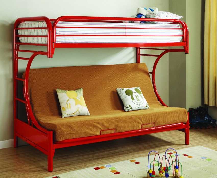 У стандартной модели кровати нижний ярус не всегда удобно использовать в качестве сиденья, так как у него не предусмотрена мягкая спинка. При установке такой конструкции в комнате не придется выкраивать свободное место для дивана. Кроме того, встроенный диван можно использовать и в качестве еще одной кровати, именно поэтому такой вариант считается универсальным.