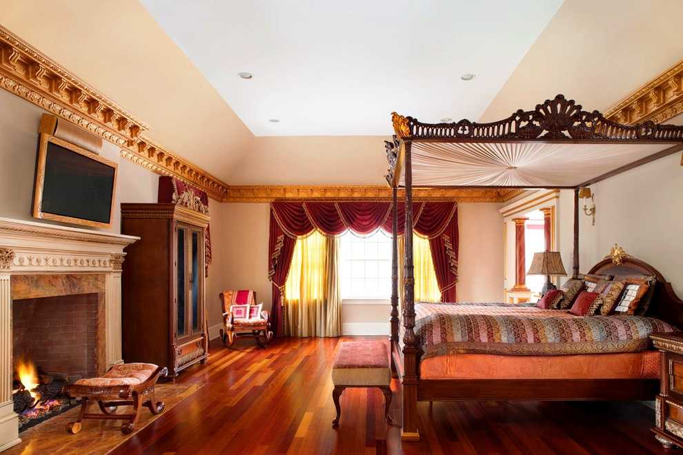 Классический вариант. Обычно это массивная кровать с резными элементами, иногда присутствует инкрустация бархатом, металлом и камнями. Нередко подобная мебель комплектуется балдахином для наиболее комфортного, если не сказать королевского отдыха;