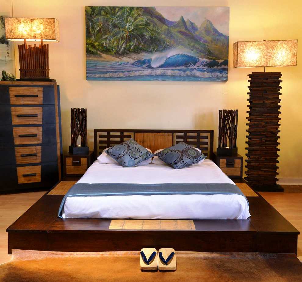 Восточный стиль. Для восточной мебели характерен аскетический, но одновременно рациональный минимализм, строгость линий и форм. Кровати, как правило, низкие, выполнены из древесины темных сортов – вишни или венге;