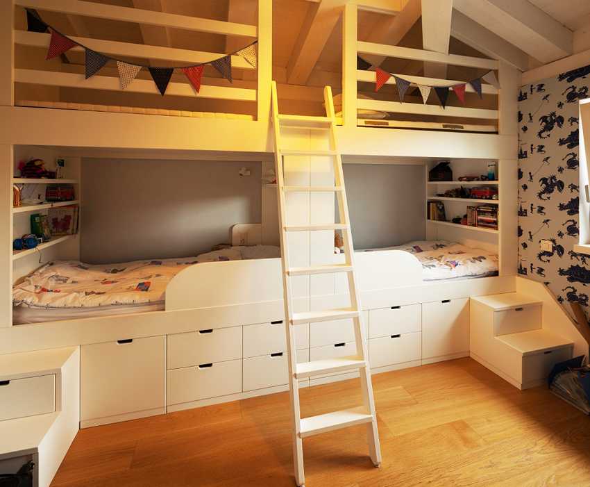 Для многодетной семьи, где проживает четыре и более ребенка, можно организовать двухъярусный комплект, состоящий из двух и более одинаковых секций. Несмотря на то, что для такой конструкции потребуется значительно больше материала, спальные места можно аккуратно расположить вдоль одной из стен комнаты, тем самым сэкономив свободное пространство.