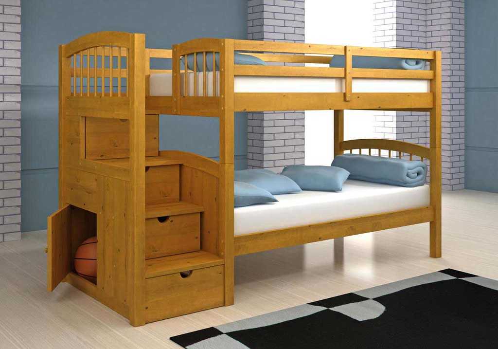 - Классическая двухъярусная кровать. Простая широкая лестница монтируется непосредственно к кровати. Моделей и разновидностей этого типа может быть великое множество.