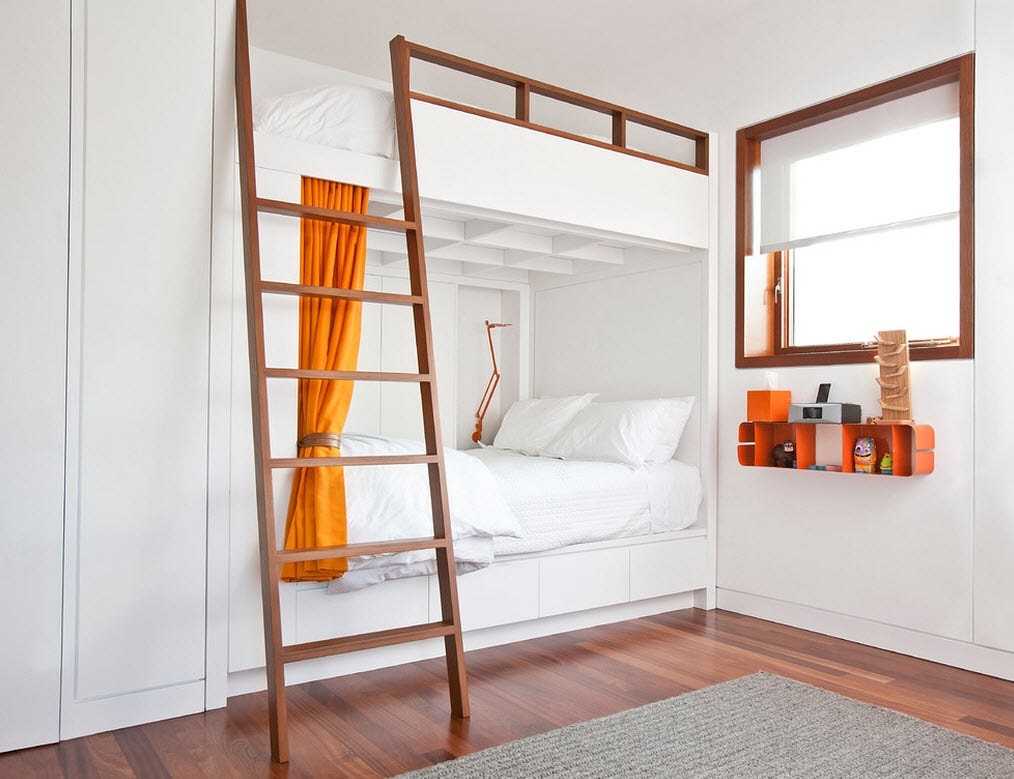 К примеру, двухъярусная кровать в простом и лаконичном дизайне без сложных конструкций смотрится очень стильно. За счет этого в комнате будет много свободного пространства, которое можно использовать по своему усмотрению.