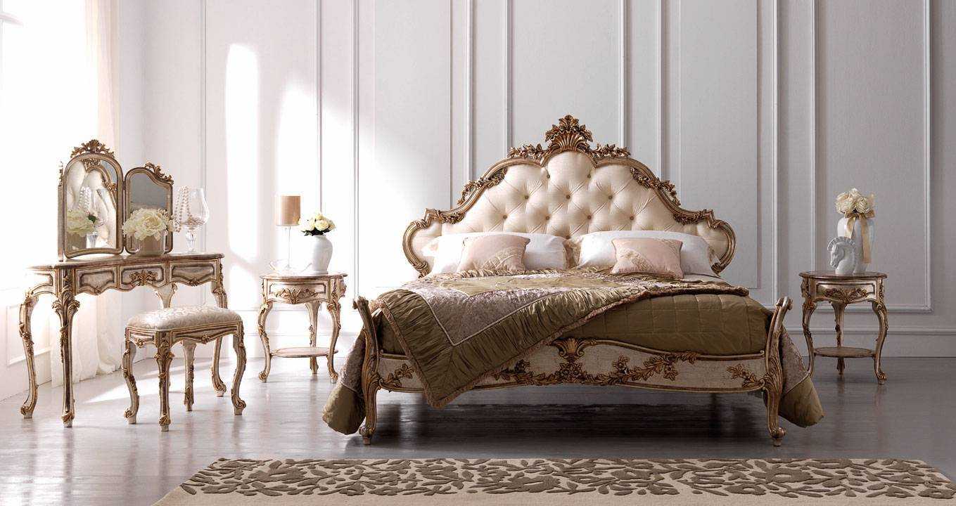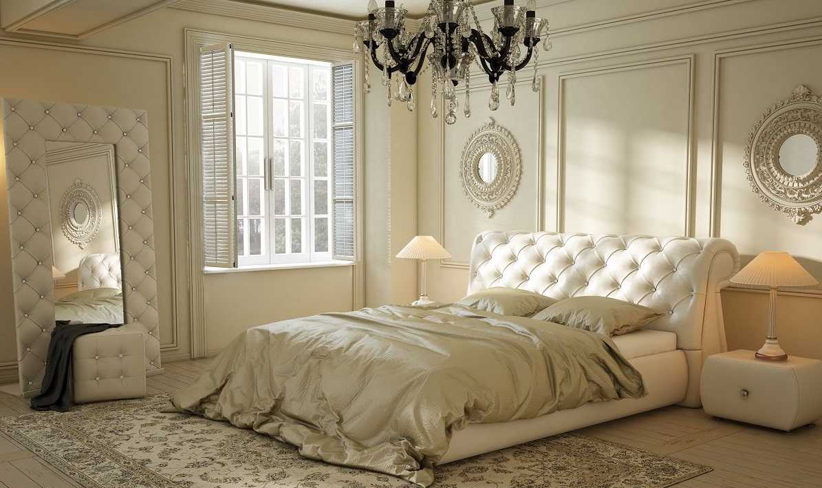 - Классический стиль. Для классики часто выбирают кровати с кожаным изголовьем. По форме оно может быть полукруглым или же изогнутым. Для шикарных спальных комнат можно найти модели с металлическим кованым обрамлением, инкрустацией полудрагоценными камнями, элементами резьбы.