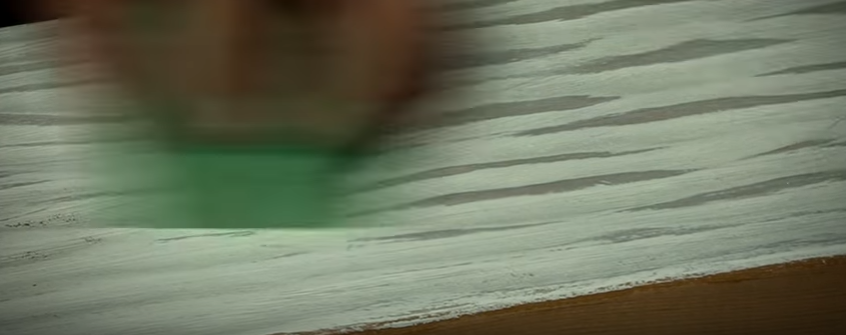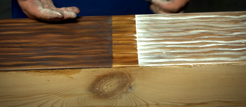 Когда покрытие полностью просохнет, снова зачищаем щеткой. Результатом такой обработки является беленая деревянная поверхность, имеющая небольшие потертости и рельеф.