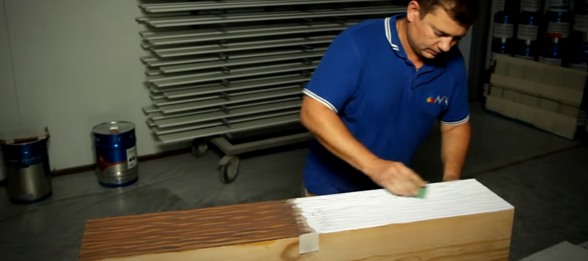 Первый способ. Он очень прост. Обрабатываемую поверхность зачищают металлической щеткой, и покрывают белой лазурью, ждут, пока она высохнет. Лазурь – это полупрозрачное покрытие, через которое проглядывает природная структура дерева.