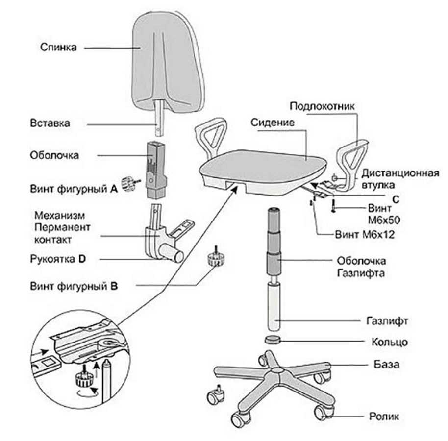 Основные конструктивные элементы изделия: сиденье, спинка и крестовина с роликами. Если хоть одна часть общего механизма выходит из строя, кресло не подлежит эксплуатации до полного устранения неисправности. Для ремонта могут понадобиться дополнительные запчасти взамен сломанных или изношенных деталей. Их можно найти в сервисных центрах или заказать в онлайн-магазине у производителя мебели. Там же можно узнать, как отремонтировать кресло своими руками с минимальными затратами.