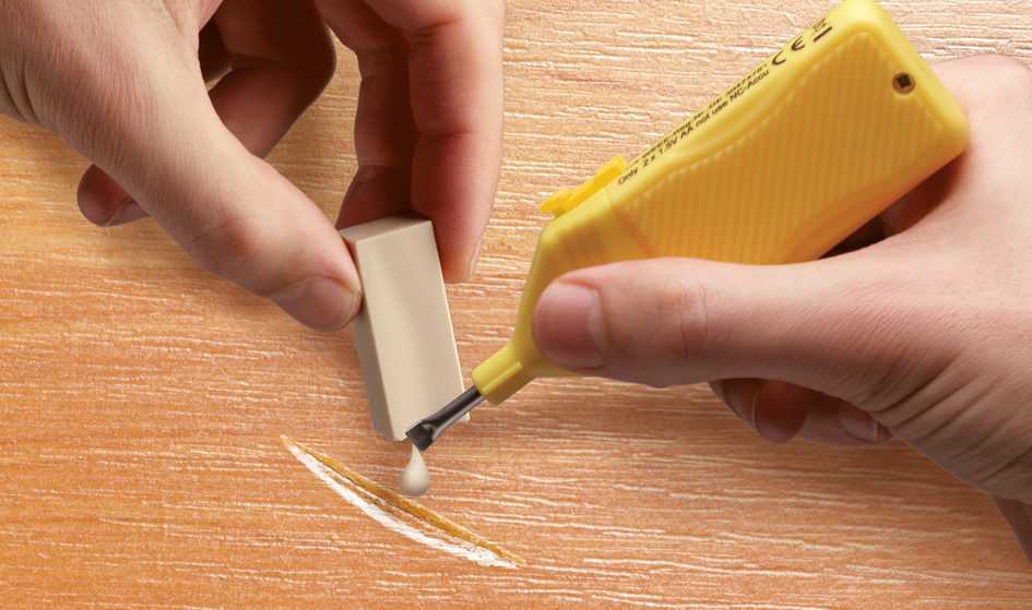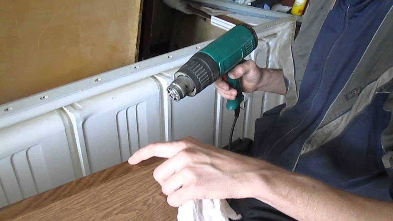 Для удаления самоклейки с деревянных поверхностей лучше использовать строительный фен. Он мощнее и температура воздуха намного выше, чем в обычном фене. Принцип работы такой же, как для стеклянных поверхностей.