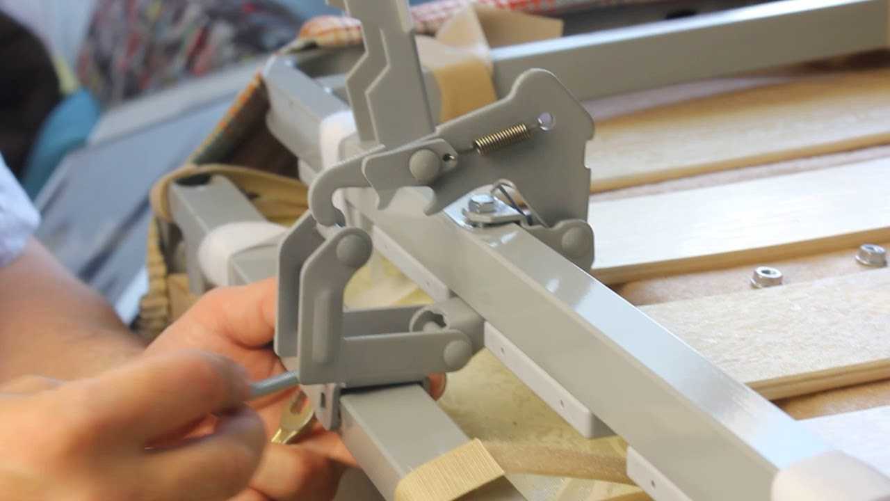 Лента прибивается с одной стороны к каркасу. Профессиональные мебельщики ее потом натягивают при помощи специального инструмента, но заменить его можно обычным бруском, обернутым вокруг по середине наждачной бумагой с крупным зерном. На этот брус наматываете пару витков ленты, двумя руками тянете (следите, чтобы рама не гнулась), ленту фиксируете скобами или гвоздями, отпускаете и обрезаете излишек. Этот же способ подходит и для повышения срока службы матраса на ламелях.