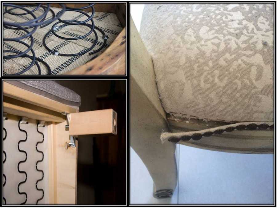 - повреждения в нижней части сиденья — порой случается так, что пружинами пробивается дыра в частях каркаса дивана, и в такой ситуации придется заменить части фанеры, предварительно разобрав мебель;