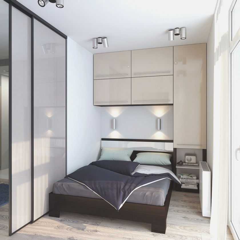 Центром комнаты является кровать. Для крошечных квартир были придуманы модели с маленьким изголовьем. Если помещение очень узкое, кровать устанавливают возле маленькой стены. Также шкаф можно подобрать до потолка и поставить вдоль короткой стенки — помещение станет похожа на квадрат. В комнатах в форме квадрата кровать устанавливается изголовьем в стенке, а тумбочки с обеих сторон. Туалетный столик ставится у окошка. Для спален в форме прямоугольника, кровать ставят к стене удлиненной стороной.