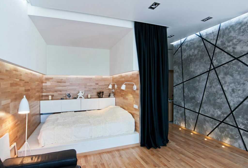 Зонирование комнаты подиумом, на котором обычно размещают кровать, позволяет не только отделить спальное место от зоны отдыха, но и оборудовать дополнительную систему хранения. Украсить конструкцию можно аккуратной занавеской из полупрозрачной ткани.