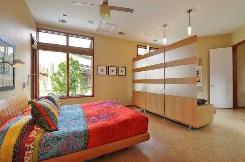 - Ряд декоративных перегородок для зонирования спальни (дерево, ткань, картон, фанера или гипс).