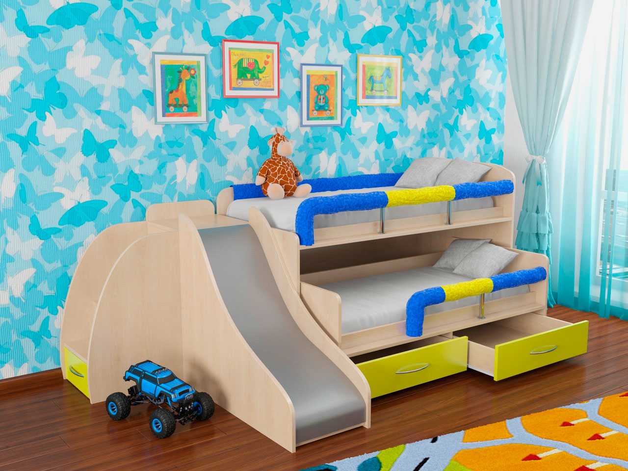 Модель с горкой — пожалуй, самый желанный вариант мебели для маленьких непосед. Малыш забирается наверх по лесенке, катается по безопасному спуску, ему это веселое приключение никогда не надоест. Для комфортного приземления чада стоит оборудовать мягкую посадочную площадку, используя ворсистый ковер или плоскую подушку. При желании можно купить модель со стационарной горкой или остановить выбор на конструкции со съемным модулем.