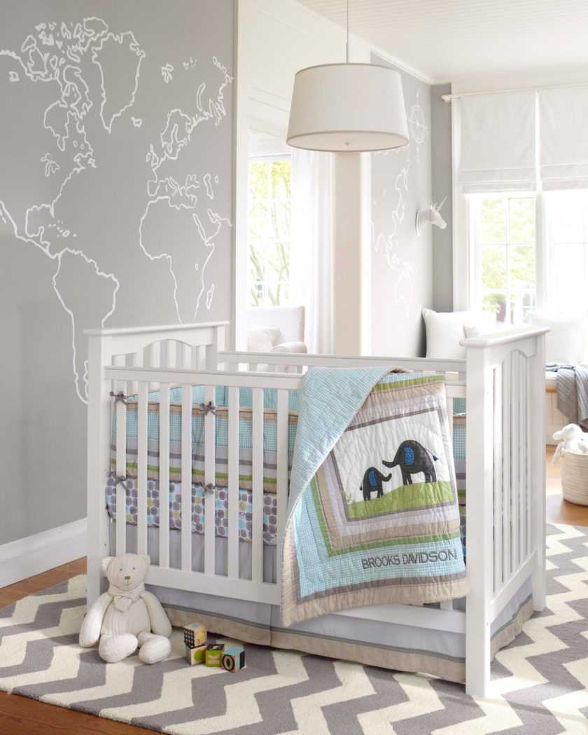 На фото детская для новорожденного мальчика с кроваткой, выполненной в белом цвете.