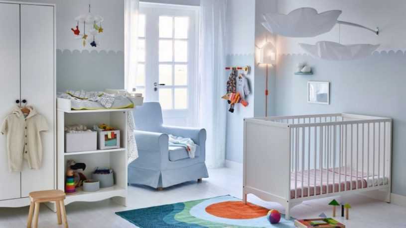 Удобно, если пеленальный столик оборудован ящиками для хранения детского белья, пеленок, памперсов, повседневной одежды. Если этого нет, в детской нужен небольшой комод – он пригодится и в будущем. Для ухода за новорожденным требуется масса нужных мелочей – салфетки, присыпки, масла, бутылочки. Для их хранения хорошо подходят открытые стеллажные полки (впоследствии пригодятся для многочисленных детских игрушек), подвесные матерчатые карманы (можно укреплять на кроватке или на специальных креплениях).