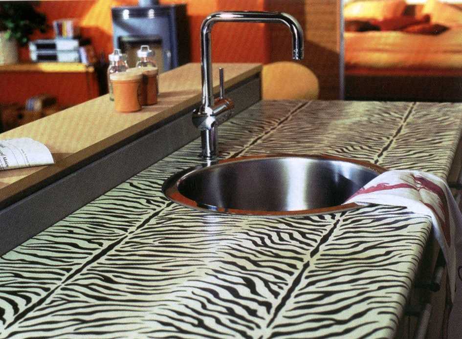 - внешний вид такой столешницы может быть совершенно любым, ведь на бумаге можно напечатать любой рисунок. Сымитировать можно поверхность дерева или камня, ткани или кожи, можно нанести на бумагу любое фото, картину, абстракцию, текстуру или понравившееся изображение;