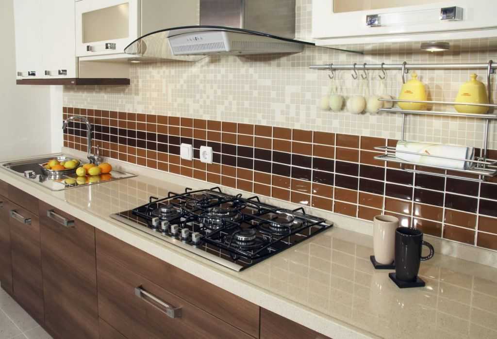 Бежевый отлично сочетается с коричневым. Если помещение не слишком большое, то можно использовать темные породы дерева для столешницы.
