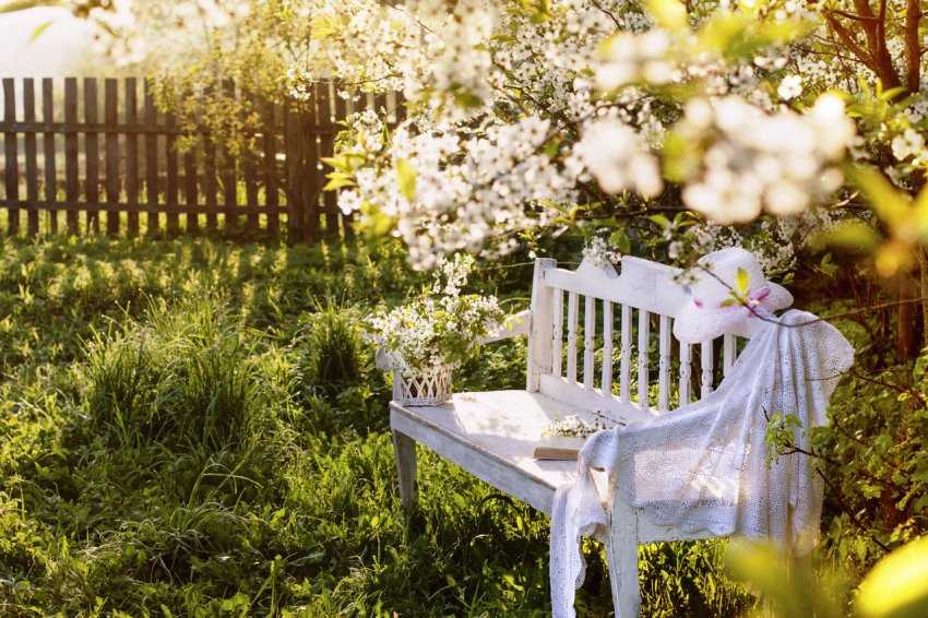 Всевозможные скамьи и лавки без спинок отлично вписываются в цветущую зелень сада. К тому же они очень полезны в быту, их можно поставить в тени деревьев и в жаркие дни отдыхать от тяжелой работы.