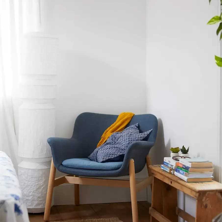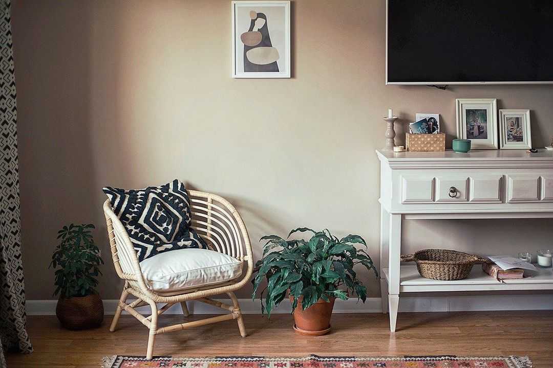 Для монохромных интерьеров лучше всего выбрать желтый или светло-серый оттенки кресла, второй вариант отлично впишется в единство картины, а первый — смело разбавит ее. Если есть опасения нарушить гармонию палитры, можно добавить в комнату элемент, схожий по цвету с креслом. Это может быть напольная лампа, большая подушка, коврик, плед. Но главное, чтобы этот предмет находился ближе к противоположной от кресла стороне, иначе есть риск создать яркое пятно, неприятное для глаз.