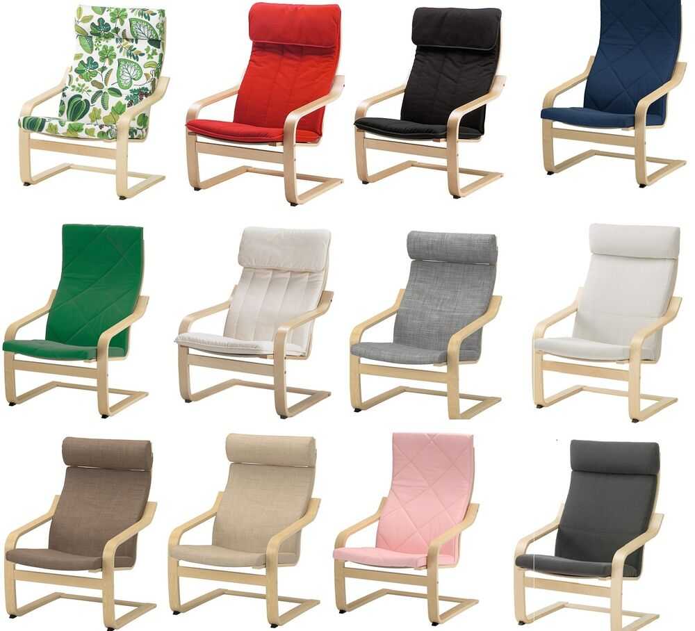 В некоторых линейках присутствует белый цвет. Такие обивки бывают у раскладных кресел-кроватей или подвесных моделей из ротанга. Белая мебель подходит для спальни, загородного дома. Красиво смотрится меховой белоснежный чехол у кресла-яйца или кресла-мешка. Черный цвет чаще используется для офисных моделей, подходит для кабинета или строгой гостиной в аристократическом стиле. Яркие расцветки выбираются для комнат, оформленных в современном стиле, ретро или кантри. Чаще всего используются желтые оттенки, красный, зеленый, синий, оранжевый цвета. Кроме однотонного оформления, мебель ИКЕА часто имеет разноцветную обивку. Особенно хорошо такие кресла вписываются в детскую комнату. Они могут быть оформлены рисунками, цветочными принтами, геометрическими узорами.