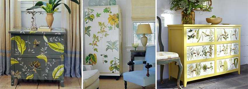 Фанерное бюро, оформленное в ботаническом стиле в технике декупаж, очень оригинально. В таком стиле выполнена целая серия мебели, разработанная дизайнерской студией Martha Stewart Living. Цветочные мотивы выглядят очень гармонично, а декорировать мебель в таком стиле достаточно просто — основа покрывается грунтом, затем приклеивается заготовка с рисунком, а после покрывается лаком.