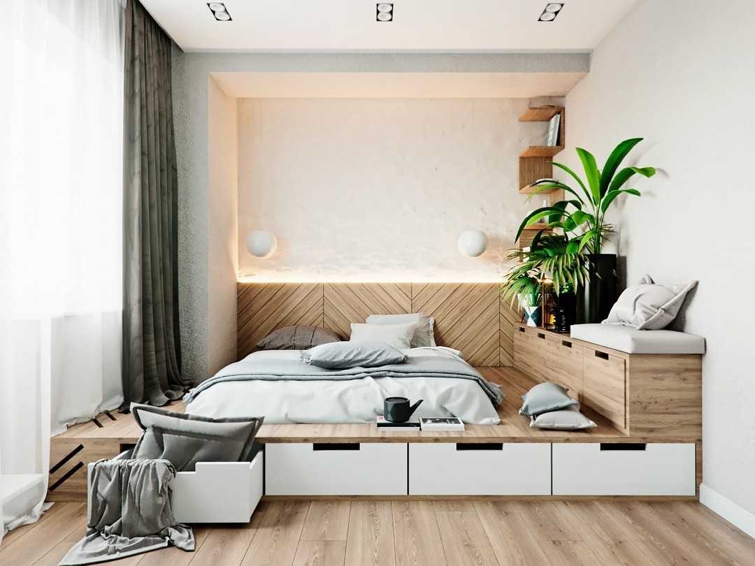 Если размеры комнаты маленькие, то вам стоит обратить внимание на кровати, имеющие дополнительный функционал (выкатные ящики, подъемные механизмы, полки и ниши в изголовье). Зачастую подобные кровати оснащают осветительными приборами, что делает дизайн еще более креативным