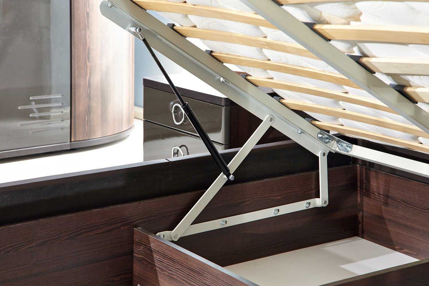 В условиях дефицита жилого пространства кровать с подъемным механизмом позволит оборудовать просторное спальное место. Основание плотно прилегает к каркасу, поэтому хранящиеся в ящике предметы защищены от пыли и влаги