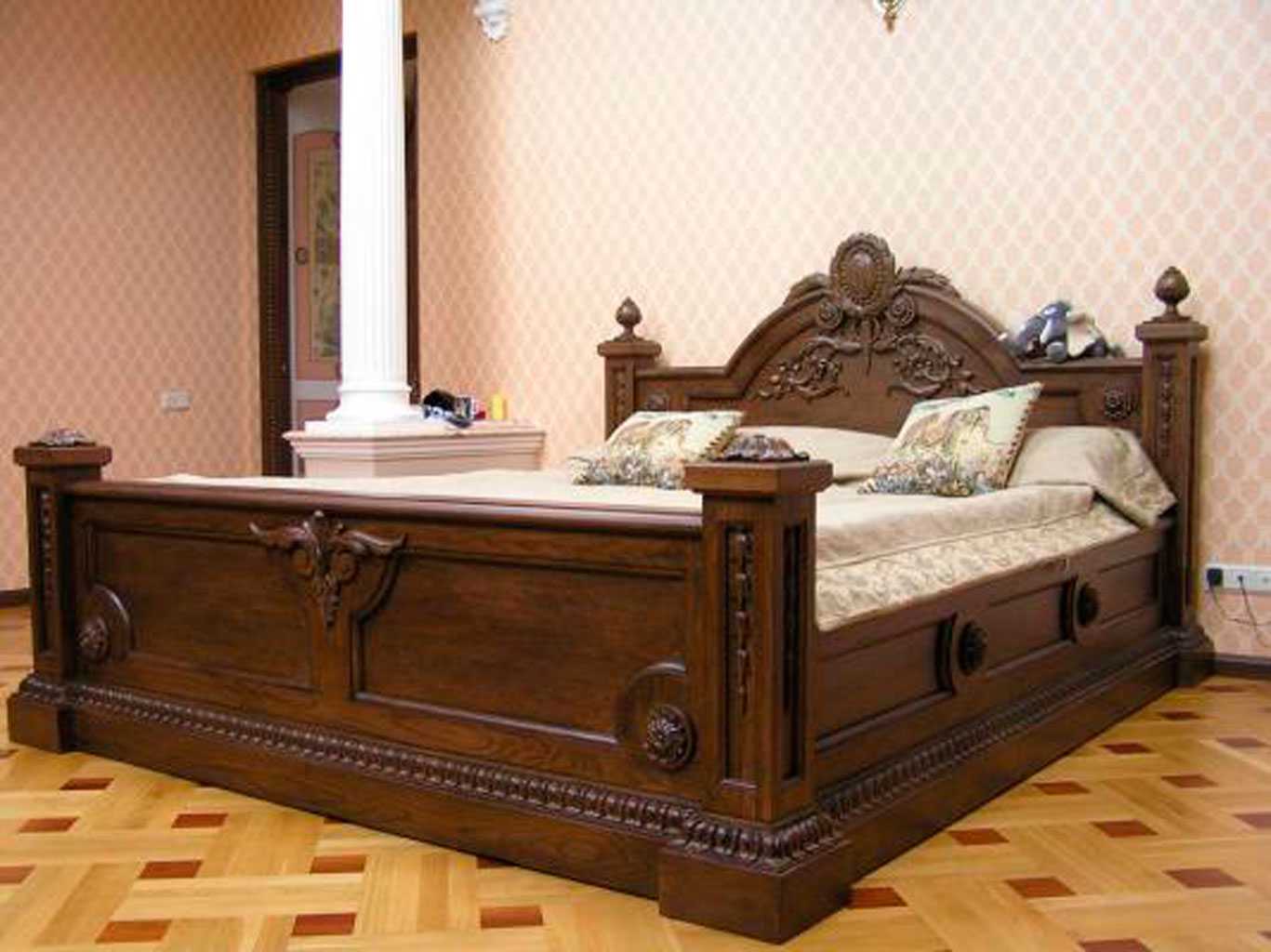 Резная кровать из массива с интересными элементами декора будет актуальна для стиля модерн. Конструктивно кровать должна быть простой и функциональной без лишних нагромождений. В оформлении такого интерьера рекомендуется использовать мебель темных оттенков.