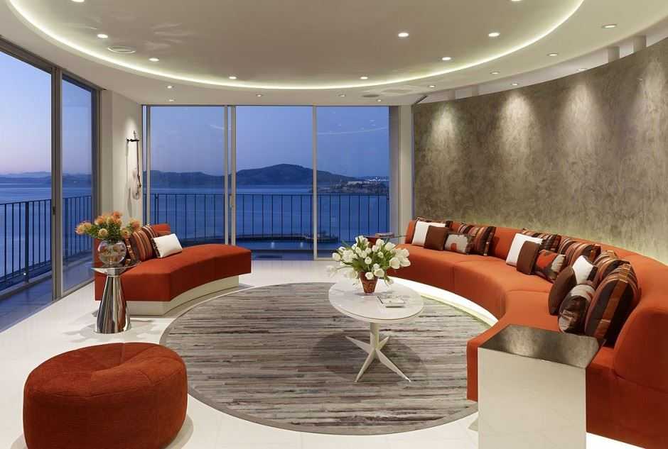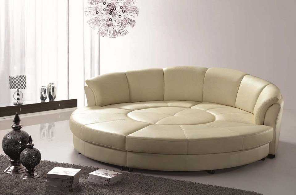 Круглый диван для просторной комнаты обычно ставится по центру. Его можно дополнить журнальным столиком и пуфами. Для создания необычных дизайнерских решений часто с круглым диваном применяются пуфы изогнутой формы.