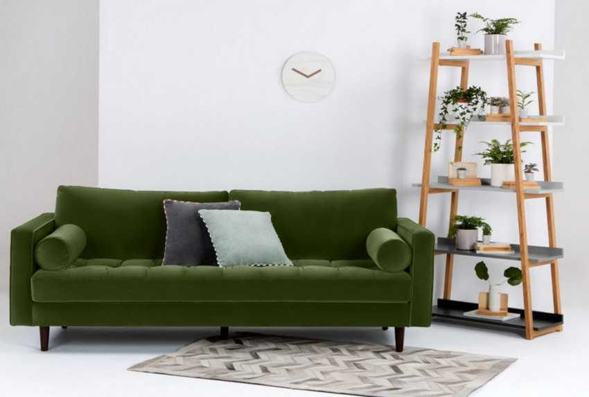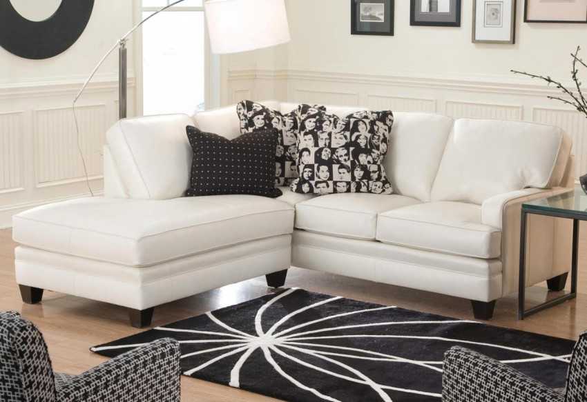 - Стилевое оформление. Дизайн дивана должен гармонировать с прочей мебелью, создавая единое целое. Модели подбираются в соответствии с формой, размерами, цветовой гаммой. Если преобладающие оттенки комнаты насыщенные или темные, отлично выглядит белый диван. Черная мебель идеально смотрится на фоне светлых стен. Для создания яркого акцента используются фиолетовые, красные, зеленые диваны.