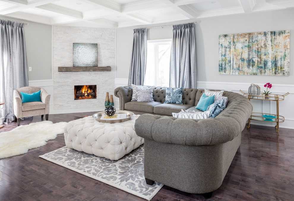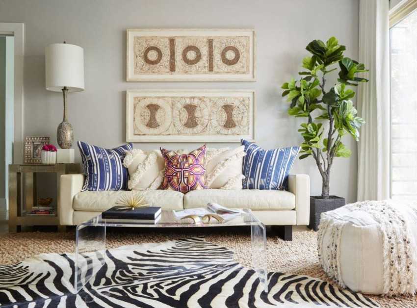 Такой вариант великолепно украсит интерьер с нестандартными архитектурными формами. Диван можно поставить напротив камина, а свободное пространство заполнить ковром, украшенным анималистическим принтом.
