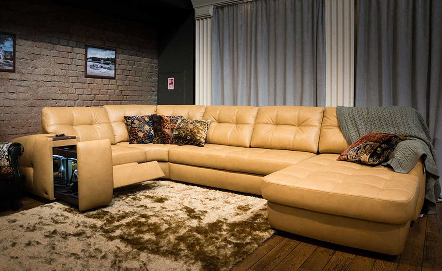 К нестандартным конструкциям относится мебель со встроенным баром, который может прятаться в спинке или подлокотнике, а также уголки со столиком или полочками.