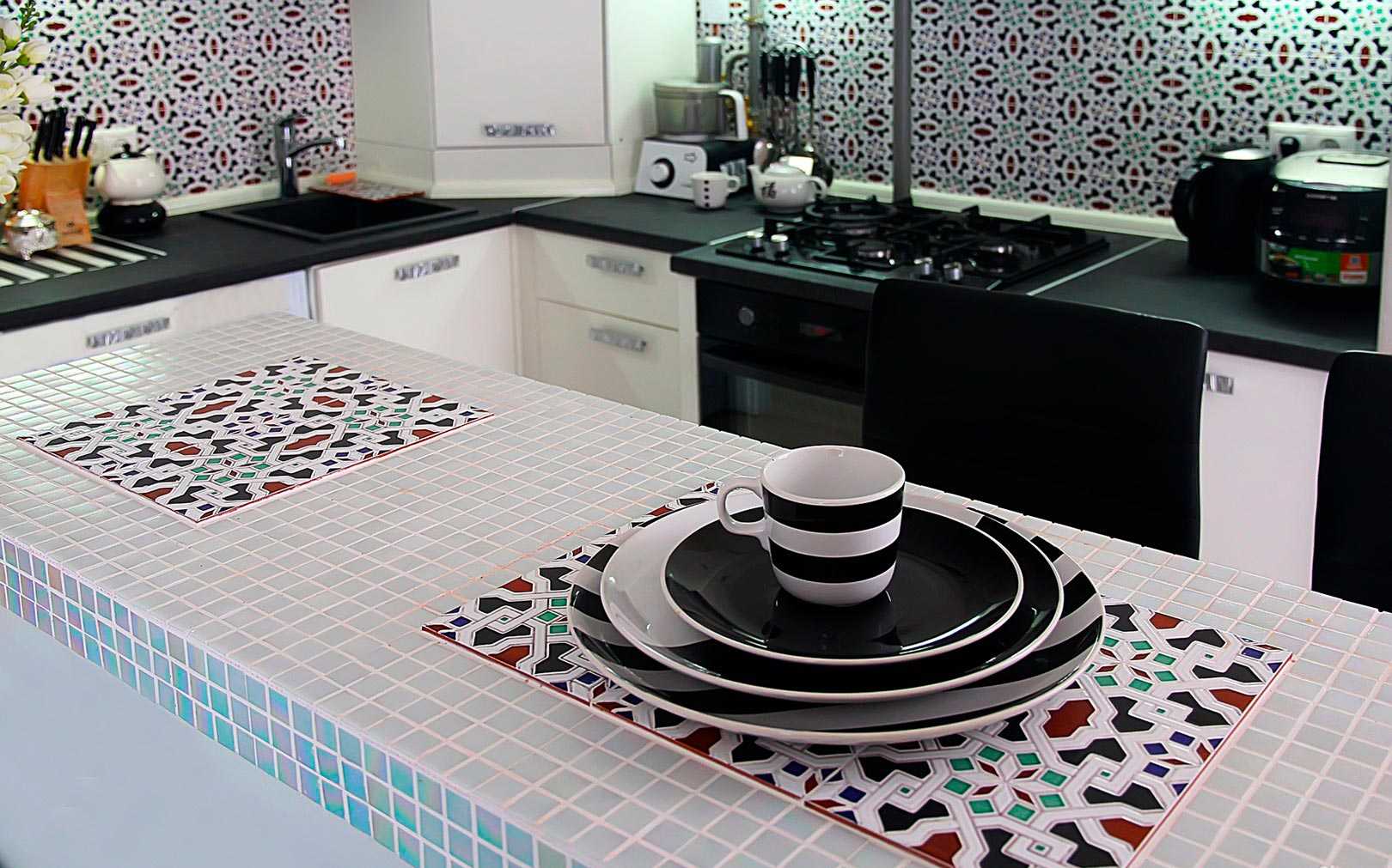 Мозаика – плитка очень маленьких размеров до 2.5 см. Изготовленная из керамогранита или мрамора, малахита или оникса, и других натуральных камней . Фрагменты мозаики могут быть самой разной формы. Столешницы, украшенные мозаикой, смотрятся идеально и эффектно одновременно. Очень гармонично будут смотреться средиземноморский или мавританский стилей.