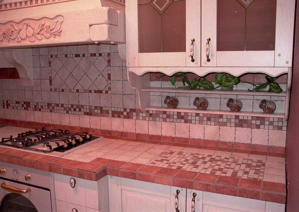 Для облицовки керамической плиткой столешницу, необходимо выбирать глазурованную плитку. Предпочтение стоит отдать небольшим размерам 10 × 10 см – такая поверхность будет выглядеть аккуратно и элегантно. Для кромки и торца кухонной поверхности покупают пластиковые или металлические плинтусы, уголки и бордюры. Разнообразие цветов дает возможность воплотить самые смелые дизайнерские решения.