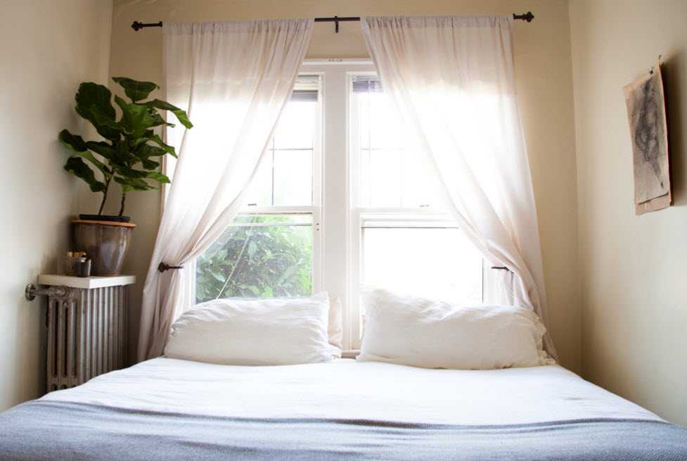 Чем проще будет интерьер спальни, тем лучше это отразиться на ее восприятии. Отдавайте предпочтение светлым однотонным цветам, простым линиям, легким тканям. Так, окно лучше оформить простыми светлыми шторами, а не массивными портьерами. В данном случае лучше отказаться от крупных рисунков, замысловатых орнаментов, а идеальным вариантом станут рулонные или римские шторы. При сохранении всех тех функций, которые необходимы для штор, они занимают минимум места и не сужают пространство.