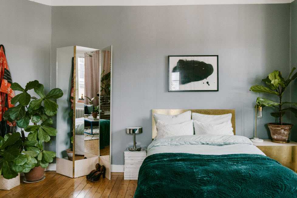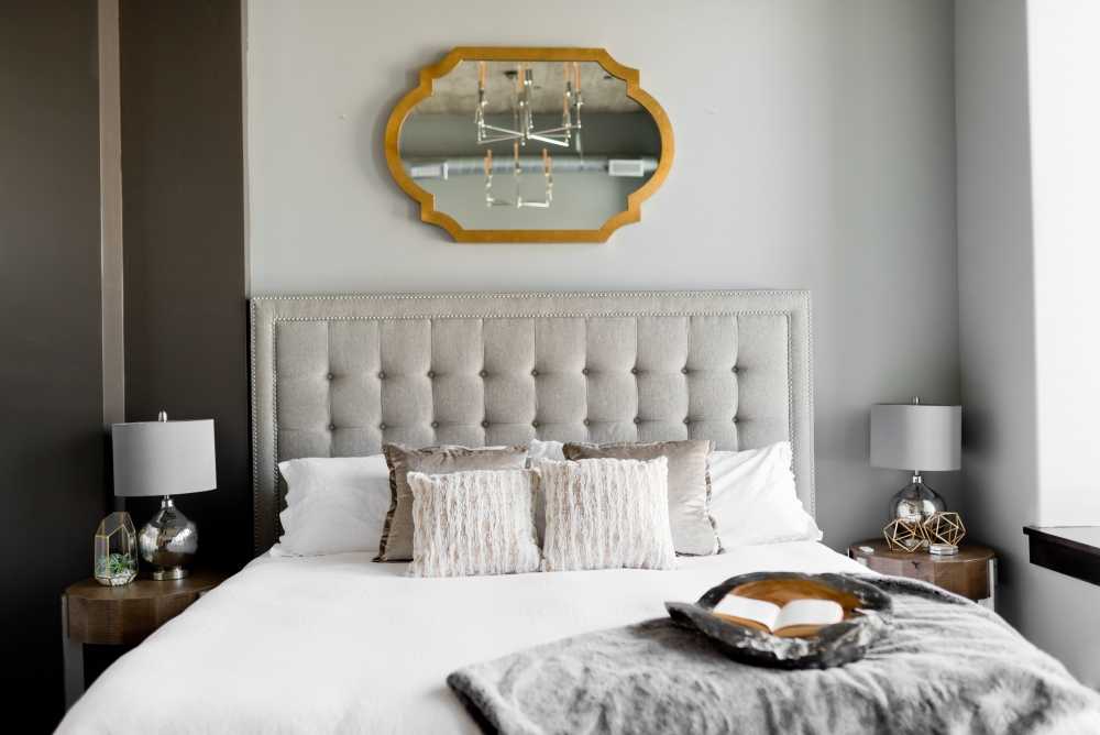 Если вы хотите оптически увеличить комнату, решите повесить зеркала. Их можно найти на раздвижной двери шкафа, а также на стене. Зеркало, подвешенное в серебряной раме, также будет отлично отражать свет.