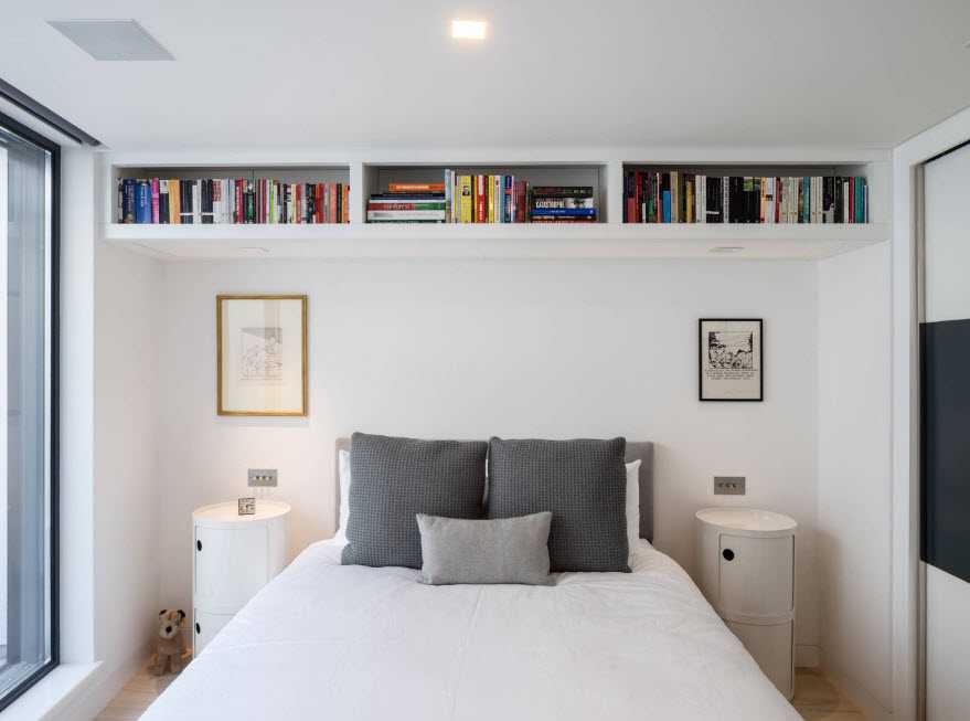 Чтобы рационально использовать имеющуюся полезную площадь, одну из стен можно обустроить узкой мебелью встроенного типа. При этом во избежание эффекта присутствия на складе расцветка мебели должна быть однотонной светлой, а фактура – глянцевой. По центру стены можно создать небольшую нишу шириной, соответствующей ширине кровати. При этом для максимального задействования стены над кроватью можно соорудить полку либо стеллаж.