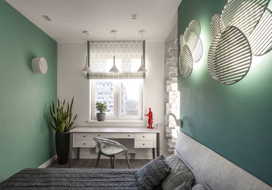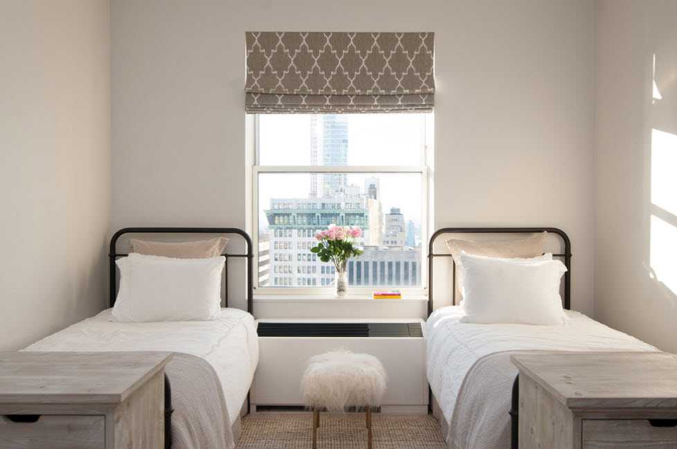 Рассматривая, как обустроить узкую спальню, рассмотрите углубление в окне. В маленькой комнате жалюзи намного лучше, потому что шторы и занавески могут занимать лишние несколько сантиметров из небольшого пространства. Наденьте оконную занавеску, которая будет соответствовать декору, но прежде всего обеспечит комфортные условия для сна и использования помещения для других целей, например, для работы.