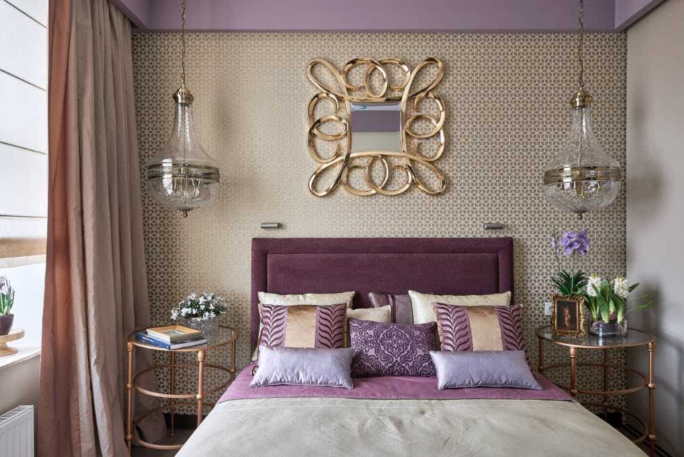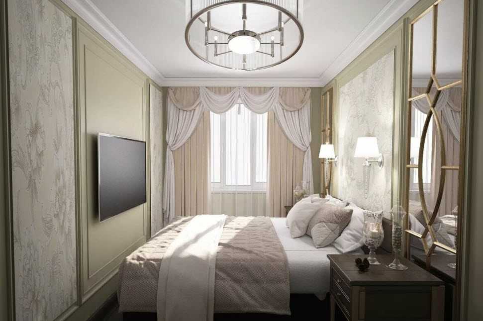 Если ты не представляешь себе спальню без пышного текстиля, люстр и роскошных декораций – рассмотри вариант классического оформления. Цвет отделки лучше выбрать из молочной, оливковой или сиреневой палитры – эти цвета будут отлично сочетаться с лепниной, хрустальными люстрами, золотистыми узорами декора и, конечно, дорогой деревянной мебелью с резными узорами.