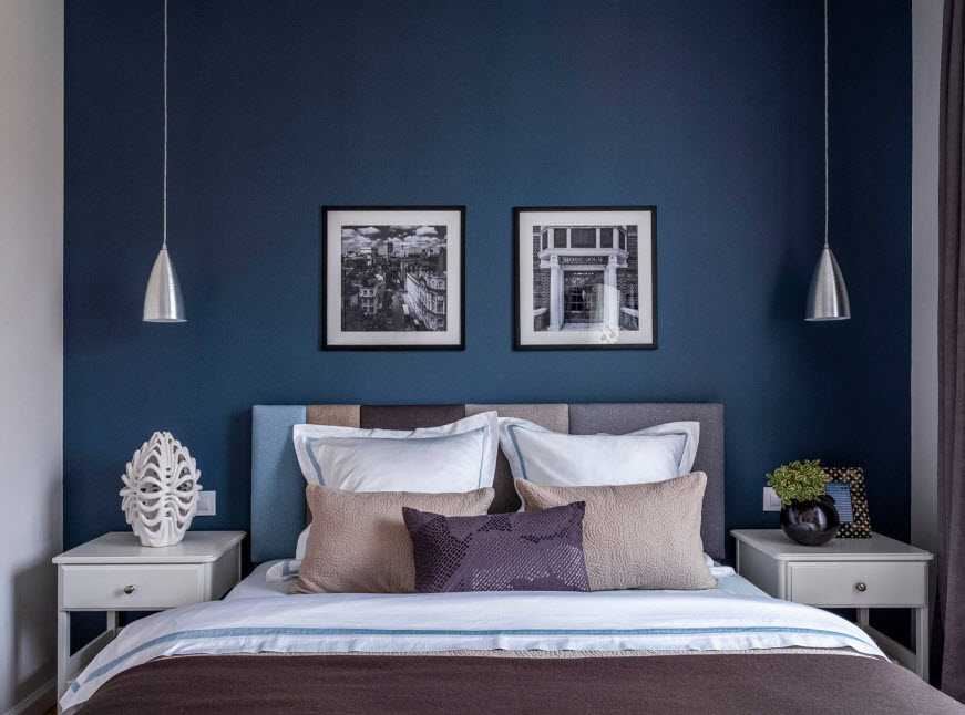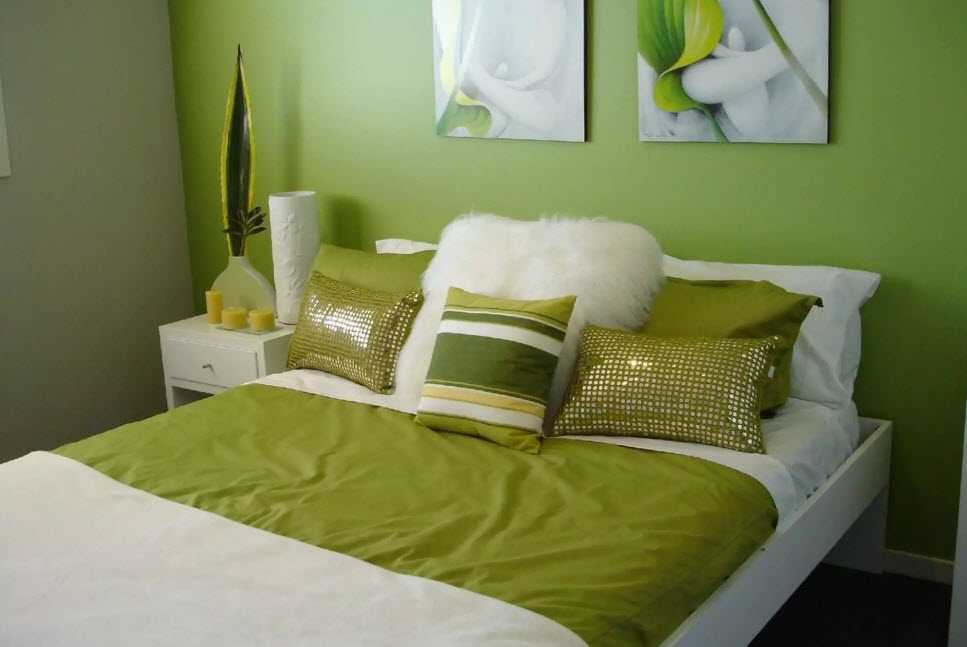 Окрашивание. Перед этим стены нужно выровнять до идеального состояния, что может быть достаточно сложно, особенно в старых домах. Для нанесения применяют разные виды красок, тут нет особых ограничений, так как в спальне на поверхности не оказывается повышенная нагрузка.