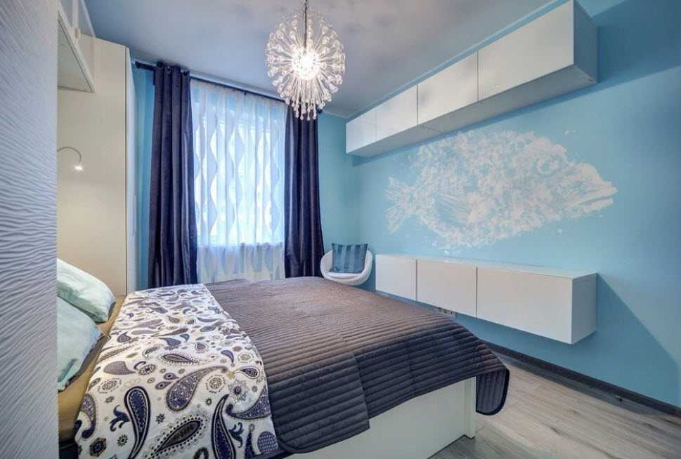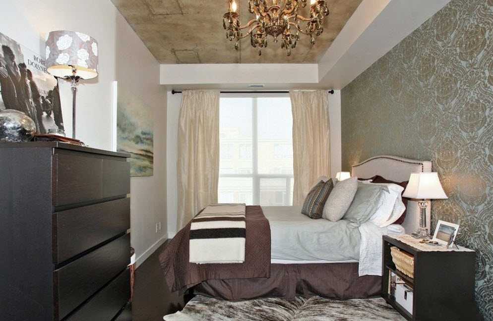 Если потолки низкие, то лучше использовать глянцевые натяжные потолки, выполненные в светлых тонах. Украсить поверхность можно небольшими точечными светильниками, что позволит создать романтичную атмосферу. Стены в маленькой спальне должны быть светлыми, максимум одну из стен можно сделать более темной (акцентной). Частые и мелкие узоры будут раздражать, следовательно, от них лучше отказаться. В качестве отделочных материалов можно использовать: обои, декоративную штукатурку, побелку или краску.