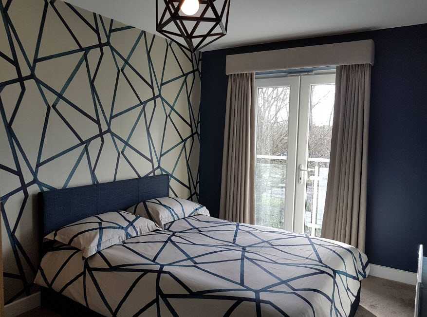 Использование фотообоев или других декоративных элементов, которые приклеивают на окрашенные стены. Тут может быть что угодно – от пейзажей до геометрических узоров или орнаментов.